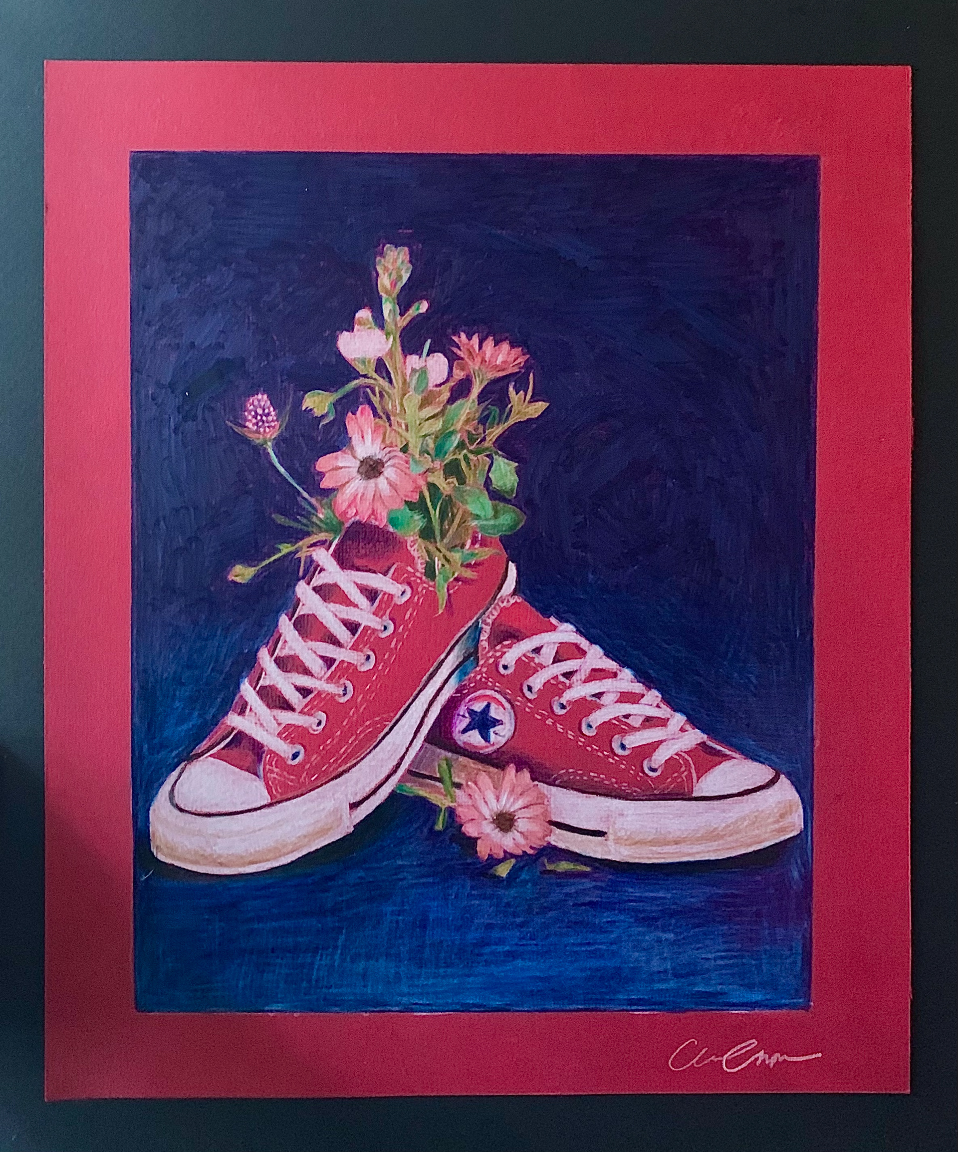 Converse in colored pencil. Done on red paper which is used for the main shoe color.