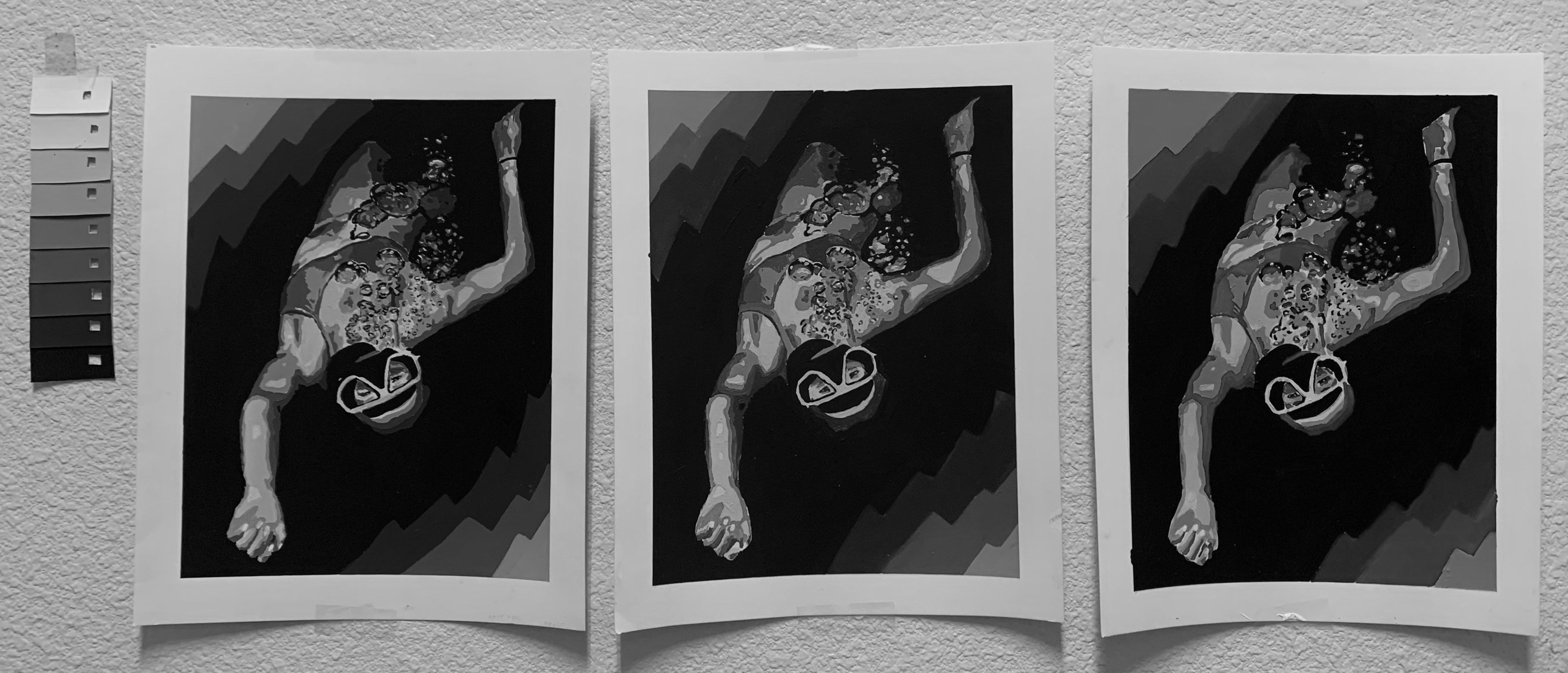 Value-driven acrylic paintings. All pieces use different color schemes ( 1-B&W 2-Complementary 3-Analogous), but look almost the same when all saturation is taken away.